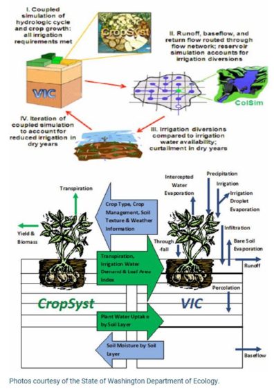 Three modeling tools are developed and integrated together to provide the most accurate results. The Variable Infiltration Capacity (VIC) model allows us to track the water balance across the geography of the Columbia River Basin, including how much evaporates and infiltrates into the soil for crops to use; this shows us how crops react to different weather conditions. The Cropping Systems Simulation (CropSyst) tool determines how much water is needed by crops through irrigation, how the crop will change during the season under a variety of weather conditions. The Columbia River Simulator (ColSim) simulates the movement of water in the reservoirs and provides detailed information of where water is stored for use by irrigators, municipalities, hydropower generation, and for ecological purposes. The tools work together and complement each other. For instance, VIC informs CropSyst about water supply along with daily weather and Cropsyst informs VIC of water stress levels and crop water needs.