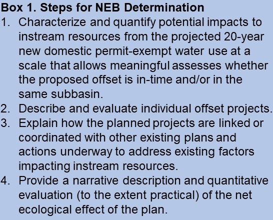 Before plans are adopted, the Department of Ecology must determine that actions identified in a plan, after accounting for new projected domestic uses of water within a WRIA over the next twenty years, will result in a Net Ecological Benefit (NEB) to instream resources within that WRIA. The Department of Ecology’s webpage for these efforts can be found on their Streamflow Restoration webpage. The Final Guidance for developing project and program plans can be found here. The final NEB guidance will be used to evaluate plans submitted to Ecology through 2021.