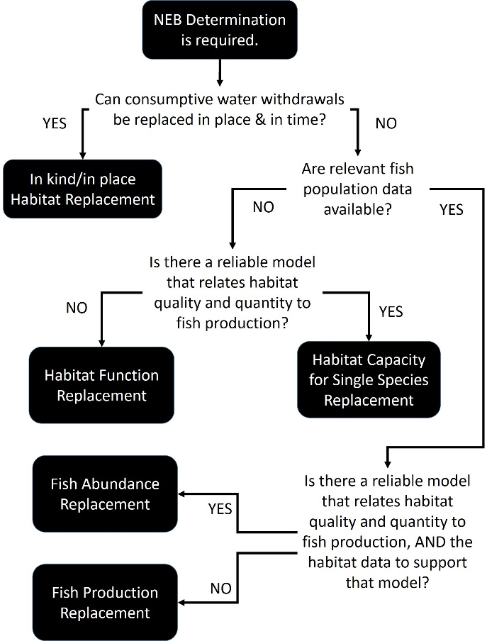 In addition, this technical document outlines five existing, relevant approaches for establishing NEB including the equivalency metrics commonly used and the merits and limitations of each approach. These five approaches include: 1) In-kind/In-place Habitat Replacement, 2) Habitat Function Replacement, 3) Habitat Capacity for Single Species Replacement, 4) Fish Abundance Replacement and 5) Fish Production Replacement (Figure 2).