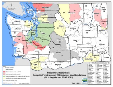 In 2018, the State of Washington passed a new streamflow restoration law entitled Engrossed Substitute Senate Bill (ESSB) 6091 (codified as RCW 90.94). This law was issued in response to the 2016 Whatcom County vs. Hirst, Futurewise, et al. decision (i.e. the Hirst Decision”), which had ruled that water would not legally be available for any new permit-exempt wells that impacted a protected surface water source or existing senior water right, and placed the burden of proving “no impact” on the counties or well applicants. With the codification of RCW 90.94, proving “no impact” for each well application is no longer required. Instead, counties and water resource inventory areas (WRIAs; Figure 1) must develop plans that can offset the potential consumptive impacts of new permit-exempt domestic water uses to instream flows.